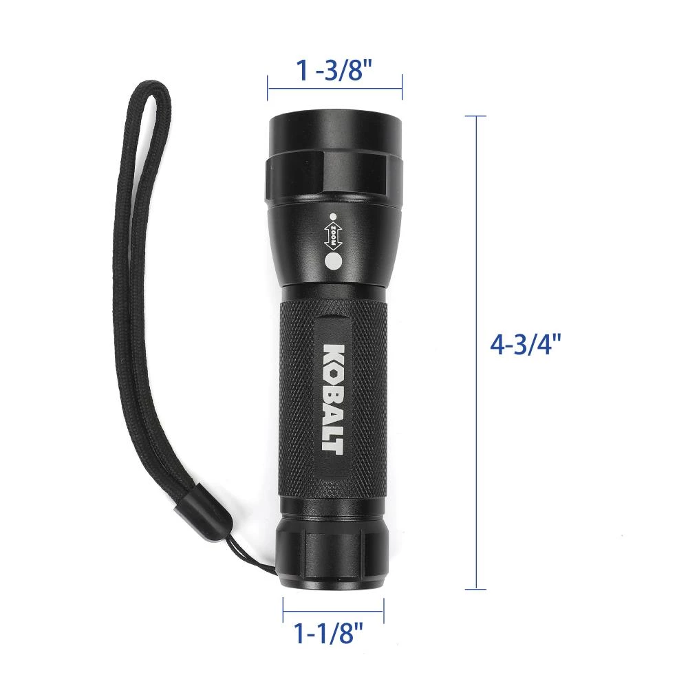 Kobalt 300 Lumen LED focusing flashlight has 3 modes: high, low and strobe and comes with 3 AAA alkaline batteries. Adjustable focus for use in different situations. Allows you to select between spot and flood beams. Compact but also comfortable to hold.this Torch flashlight also comes with a limited lifetime warranty.