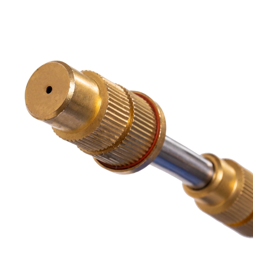 - Adjustable brass nozzle sprays liquids up to 20 feet