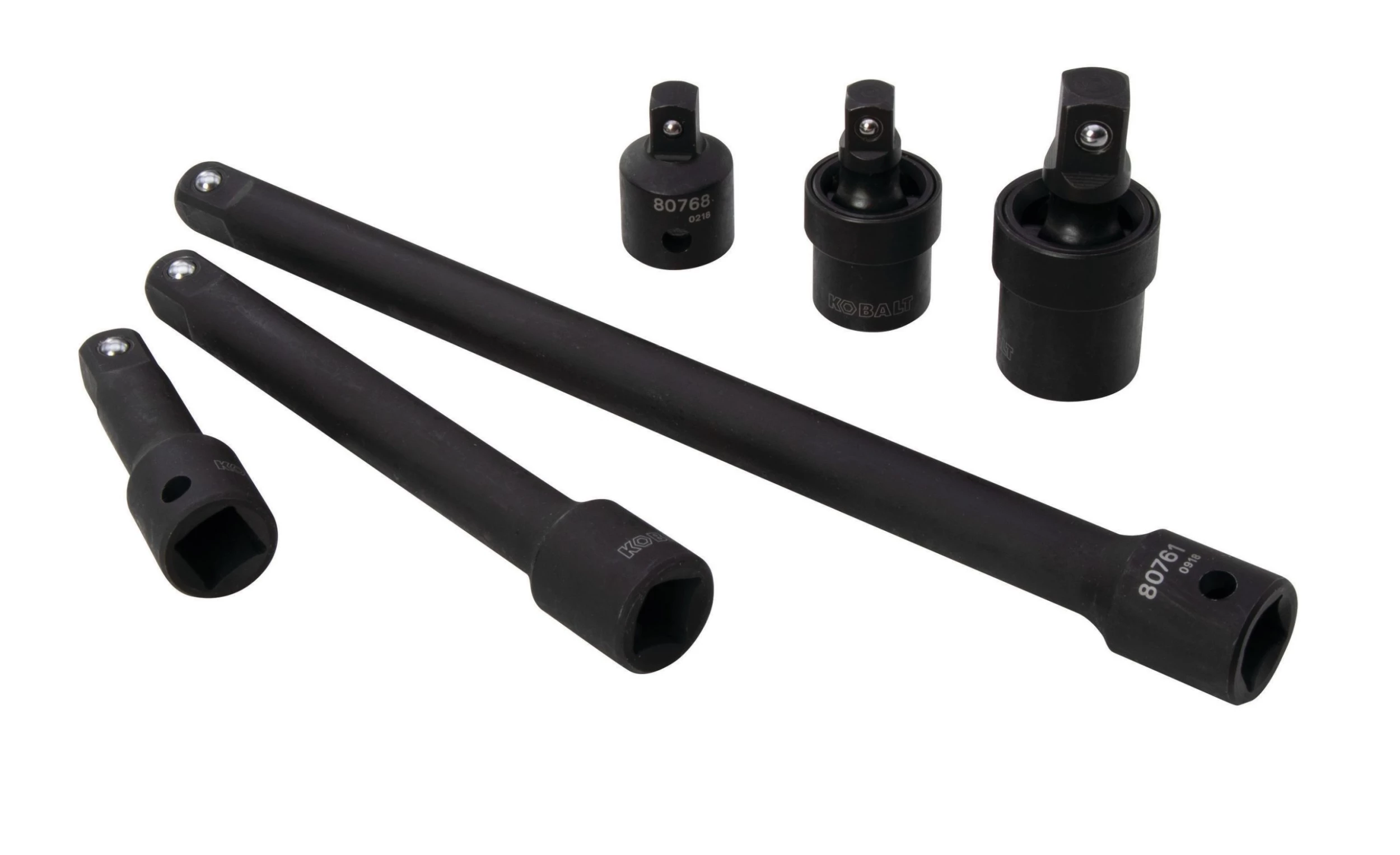 - 1/2-In drive accessory tools include a 3 impact extensions measuring 3-in, 6-in and 10-in, a 1/2-in drive impact swivel adapter, a 3/8-in drive impact swivel adapter, a 1/2×3/8-in impact adapter and a 3/4×13/16-in flip socket
