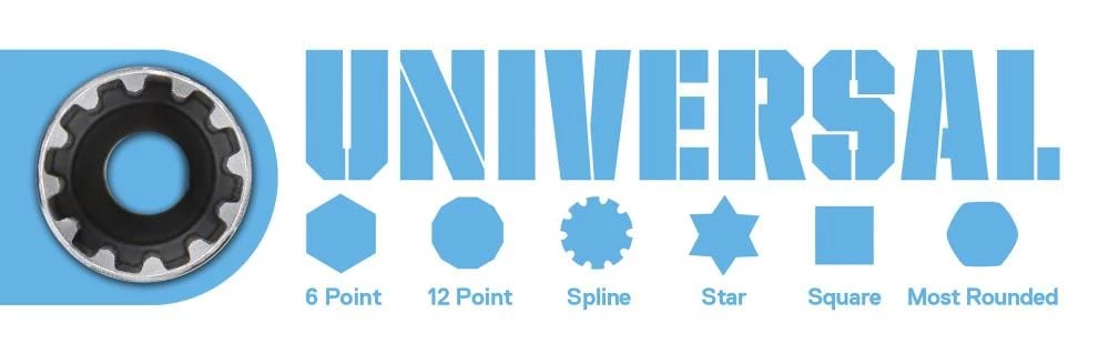- Specialized socket design allows work on multiple types of fasteners including 6-point, 12-point, spline, star, square, and most rounded out fasteners