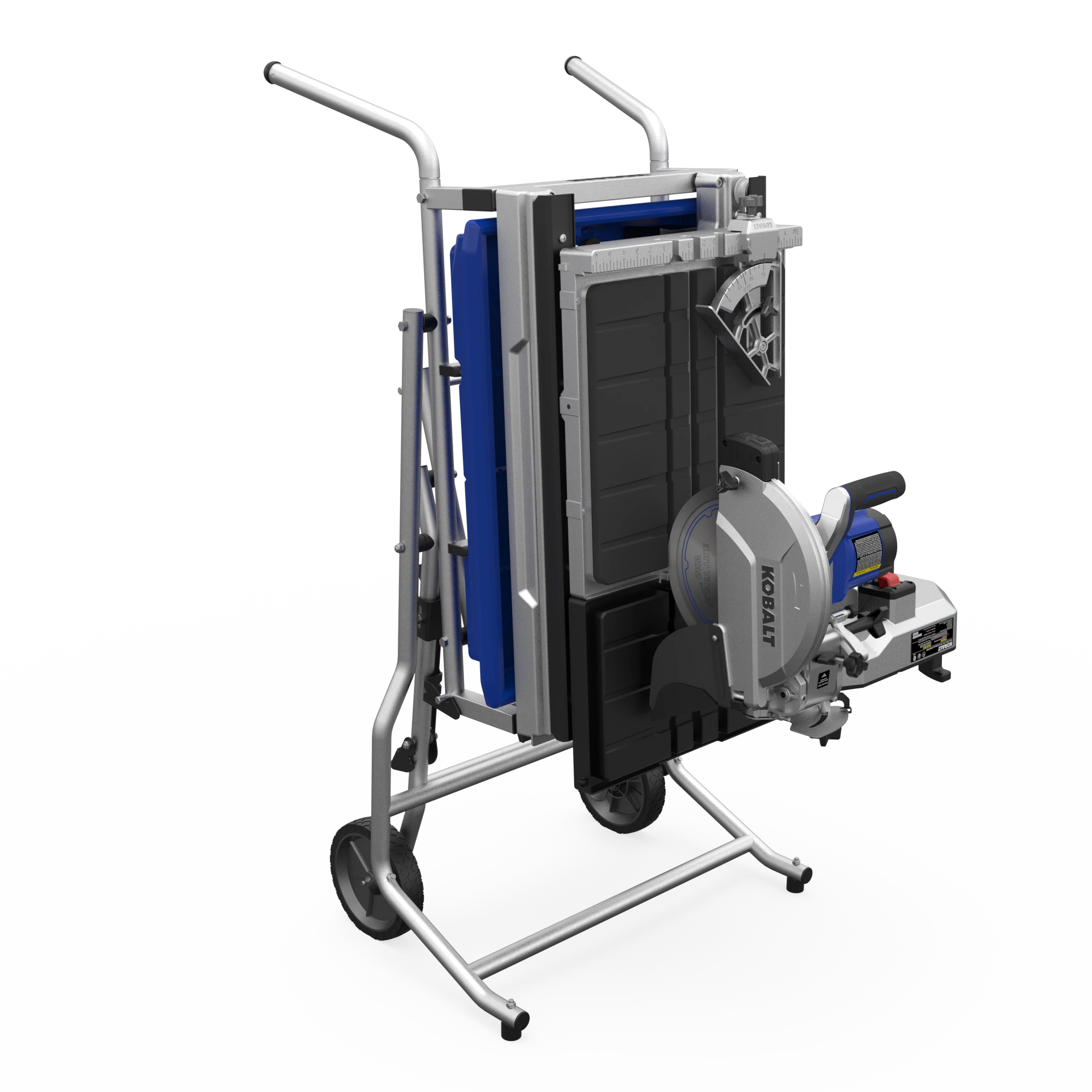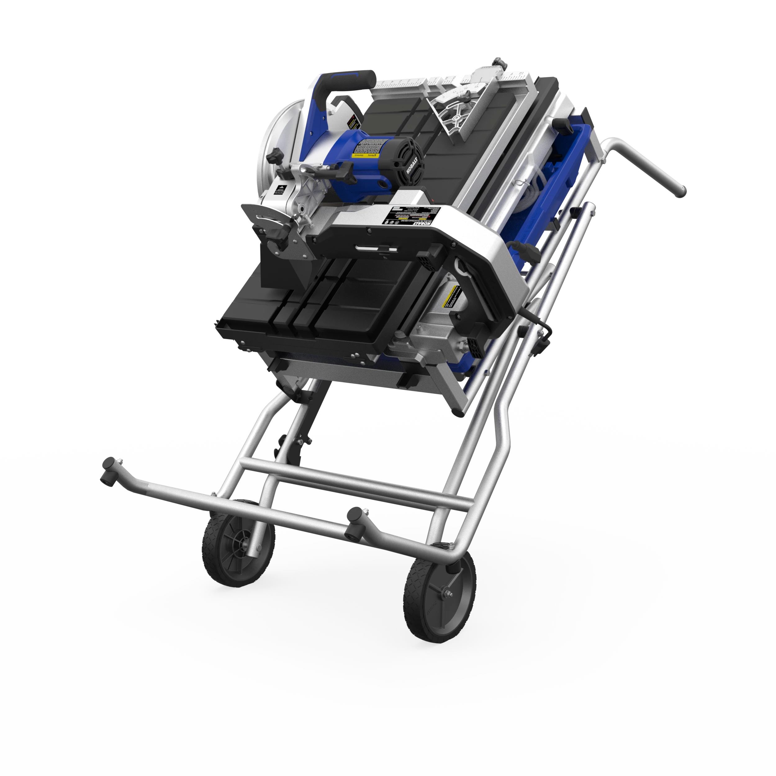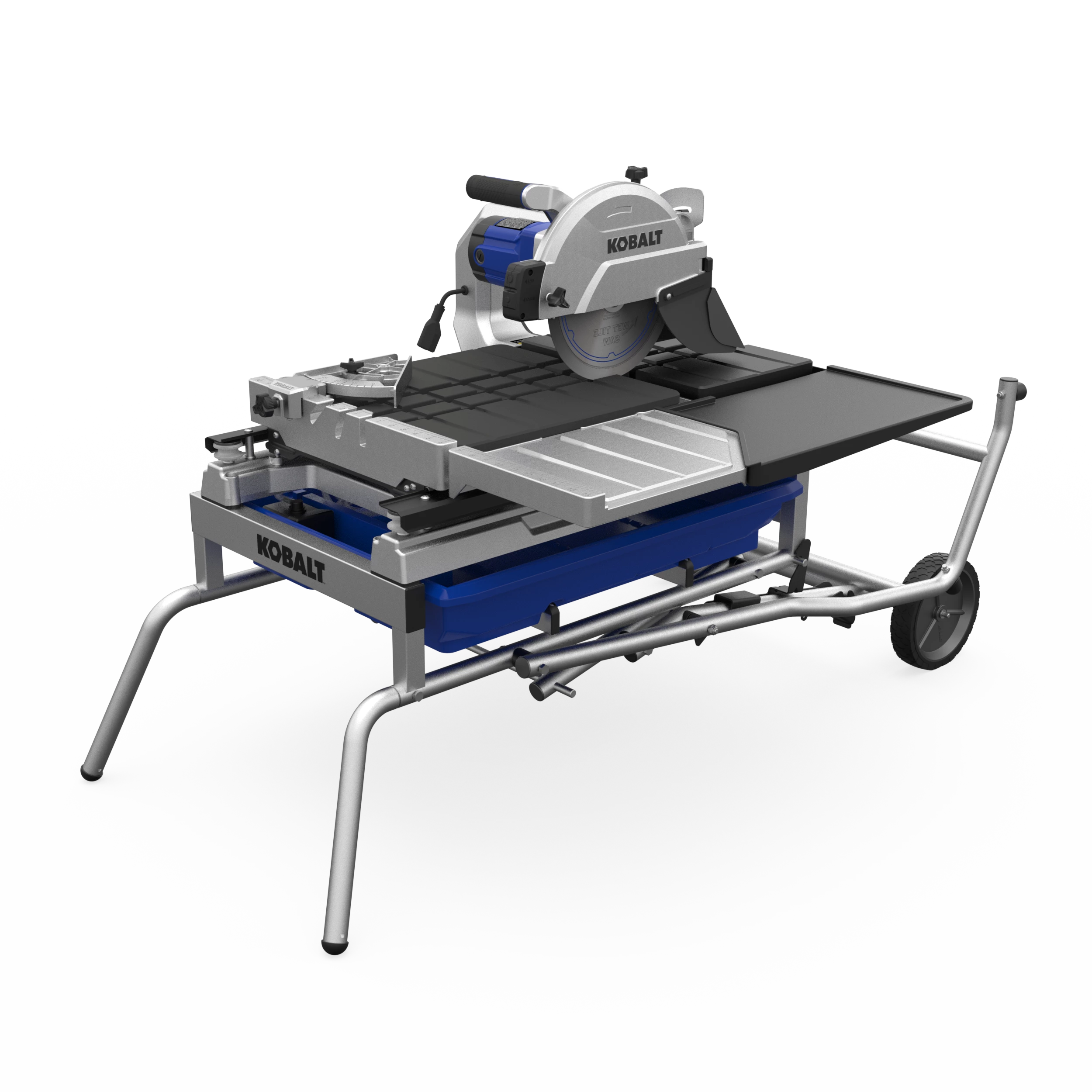 The improved Kobalt 10inch tile saw has a max rip capacity up to 36 inches, a 24″ diagonal cut capacity, with a 3-3/4 in max depth of cut. This saw is designed to rip through natural stone, pavers and porcelain. The heavy duty integrated stand with 8″ wheels makes it easy to transport on and off the job site. The splash guard helps keep the work area clean by limiting the amount of over spray.
