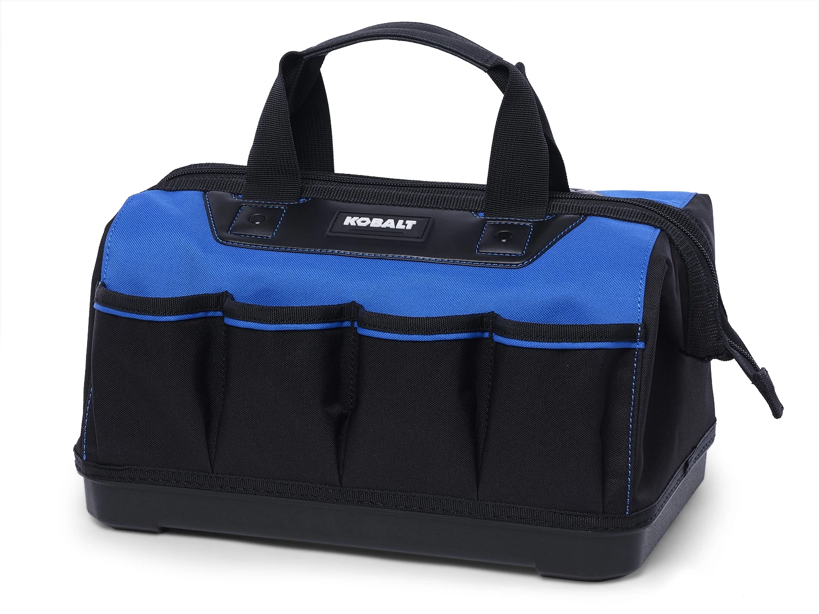 This Kobalt Tool Bag is ruggedly built to deliver years of service storing, protecting and transporting your favorite tools. Its heavy-duty construction combines a durable waterproof bottom with a semi-rigid, wear-resistant structure and a comfortable, reinforced carry-handle. Features five exterior pockets, three interior pockets and eight loops to keep you organized, and opens wide for easy access so you can quickly grab what you need.