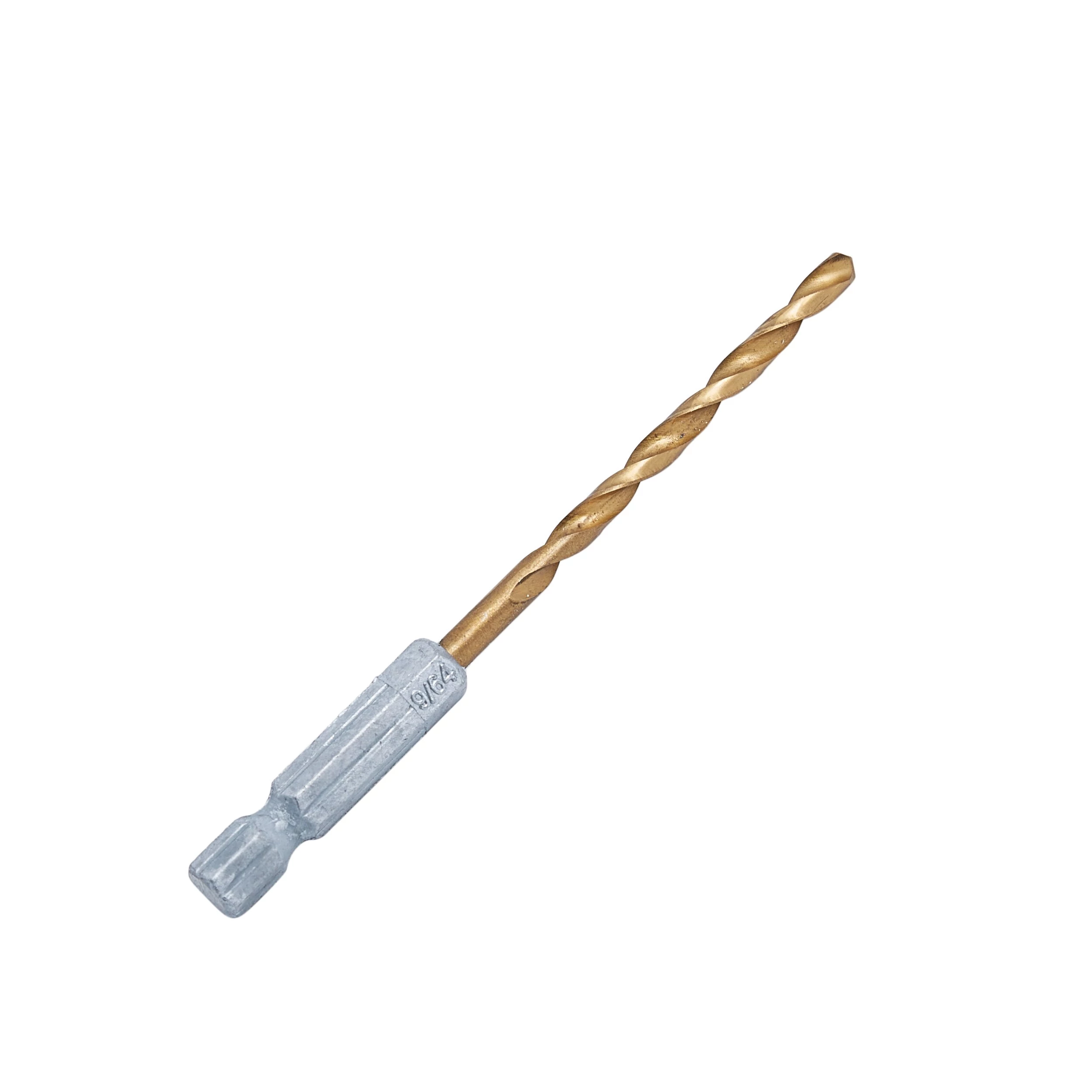 All purpose titanium coated high speed steel drill bit for use on metal, wood and plastic.